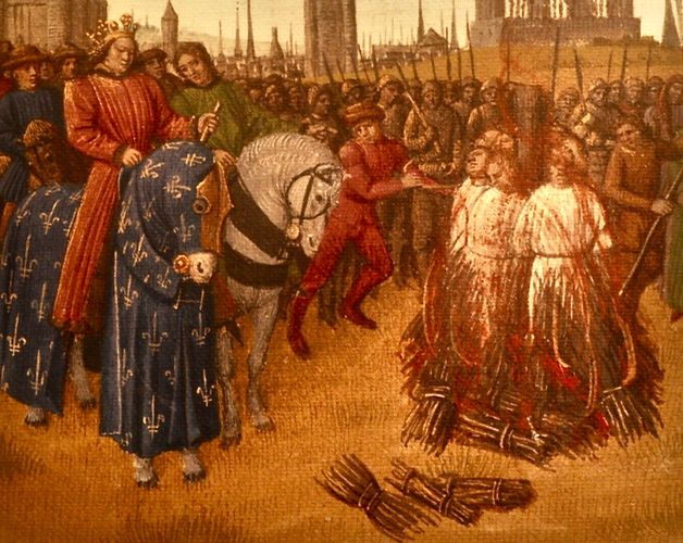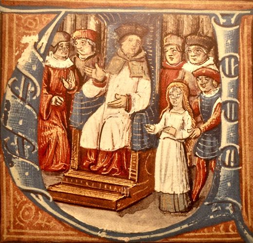 En ce qui concerne Jeanne d'Arc, c'est une justice en trois épisodes qui sera rendue. Le procès de condamnation sera un procès de foi confié à Pierre Cauchon, alors évêque de Beauvais. Jeanne comparaitra seule, conformément à son souhait et répondra trois mois durant aux questions de 120 experts, théologiens et spécialistes en droit canonique. Une première sentence la livrera à la justice laïque, donc au bûcher qui était prêt, à la grande satisfaction des Anglais. Puis, une deuxième sentence sera prononcée en faveur de la prison à perpétuité histoire de donner à Jeanne le temps de la repentance. Une sentence finale la livrera au bras séculier et la condamnera comme hérétique.