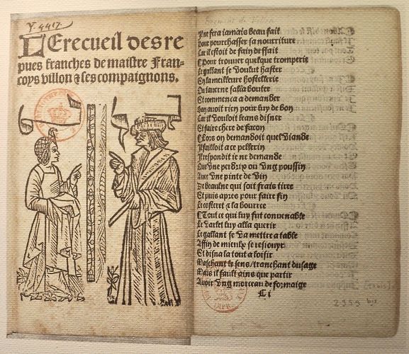 L'exposition se referme sur François Villon, clerc de l'Université de Paris né vers 1431. De nature turbulente, il se livrera d'abord à l'enlèvement d'une borne de rue, puis participera à une rixe-homicide trois années plus tard, avant de dérober 500 écus dans le coffre du Collège de Navarre, mais s'en sortira à bon compte une fois de plus. Fuyant dans le Val de Loire à la recherche de mécènes princiers, il vole encore, jusqu'au jour de 1461 où une nouvelle rixe lui est fatale et le conduira au bannissement deux ans plus tard. On perdra la trace de l'homme alors âgé de 32 ans. Il est vrai que le poète qu'il était n'avait pas une vie simple et restait hanté par la peine de mort.