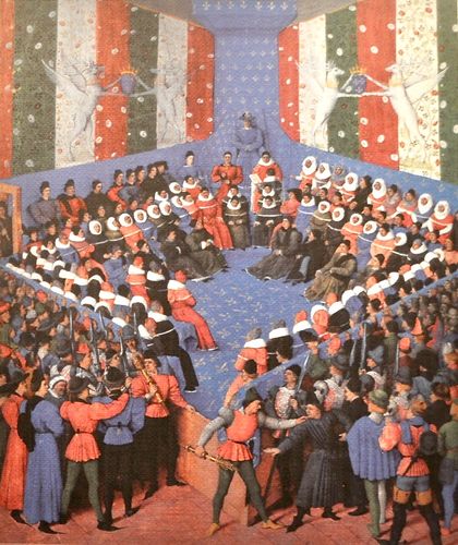 Traiter de la mort d'autrui ne doit pas être fait à la légère et suppose l'infaillibilité des juges. Ces mêmes juges devront aller puiser dans la tradition des rois justiciers, un peu à l'image de Charlemagne ou de Saint Louis. On assiste à deux types de justice, la justice accusatoire (jusqu'au 12è siècle) et la justice inquisitoire (à partir du 13è siècle, et davantage fondée sur l'enquête), reposant elles-mêmes sur des lois. La Loi divine s'impose d'abord, suivie du droit coutumier, jusqu'à ce que la diffusion des droits canonique et romain ne s'imposent peu à peu. Il reste que cette justice médiévale demeure écartelée, divisée entre l'obtention de la vérité et la recherche de la paix entre les parties. On ne dispose que de très peu d'archives car l'oral prime. On sait simplement que la négociation est omniprésente, ce qui ralentit considérablement l'exercice de la justice et coute cher. Elle favorise de surcroit la corruption des juges. Ainsi Jean sans Peur n'hésitera t-il pas à verser d'importants pots de vin lorsqu'il sera menacé d'hérésie en 1414. L'opération sera d'ailleurs « payante ». La transaction est également de mise car elle rend la justice du roi possible en écartant la vengeance. La torture, elle, est moins douce et ne sera employée que dans la seconde moitié du 15è siècle. Celle qu'on surnomme aussi gehine, tourments, ou question, a pour but d'extirper des aveux au coupable en faisant « parler » son corps par élongation des membres, ingurgitation d'eau en grande quantité, pratique de l'estrapade, utilisation du feu ou garrotage des membres (pelote). Meurtriers et incendiaires de maisons sont les premiers visés par cette torture qui est alors pratiquée dans une chambre de la prison ou du tribunal, ou dans les basses-fosses des châteaux. Quant au Parlement de Paris, il veille à ce que celle-ci ne soit pas « haineuse » et soit appliquée dans les règles.