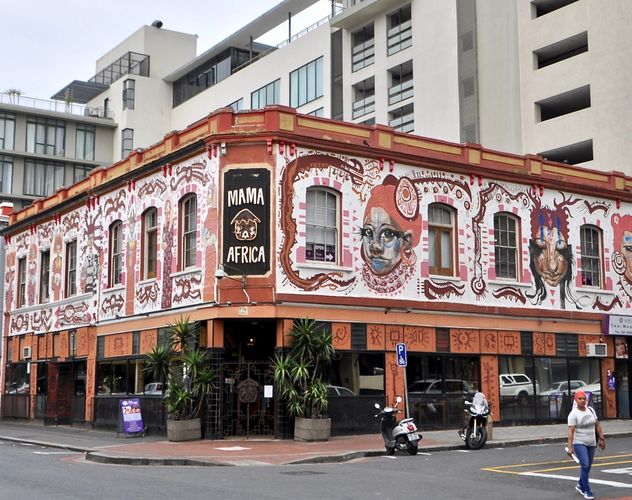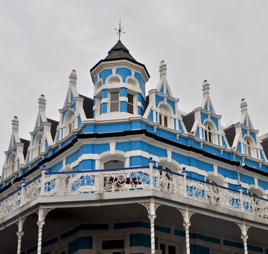 Je me dirige ensuite vers Long Street en traversant Church Street, une charmante rue occupée par de nombreux artisans qui y présentent leurs créations originales (bijoux, masques...). Long Street et longue, comme son nom l'indique mais m'offrira des façades aux styles architecturaux différents. Les communautés qu'on y croise sont aussi nombreuses. J'observerai au passage une prière musulmane de rue, et croiserai une population mélangée, dont les Malais du Cap. La rue que j'arpente est la principale artère du centre-ville et abrite plusieurs maisons à pignon de style hollandais, genre d'édifice typique souvent rencontré dans la Province du Cap-Occidental, des maisons de style victorien avec leurs balcons ornées de ferronneries ouvragées (en photo ci-dessous) ou des demeures nettement plus africanisées (deuxième photo). Je découvrirai aussi des façades partiellement recouvertes de mosaïques (un petit tour sur mon album-photos vous en donnera un aperçu), autant de témoignages artistiques originaux....