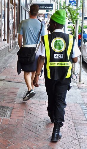Aujourd'hui capitale de la Province du Cap-Occidental, Le Cap fut fondée en 1652 et est restée depuis la ville la plus australe du pays. Elle tire en fait son nom du cap de Bonne-Espérance qui sera découvert par le Royaume de Portugal et qui n'est situé qu'à moins de cinquante kilomètres au sud du centre historique de la cité. C'est à dire City Bowl, ville historique du Cap actuel, assortie plus tard, en 1913, de quartiers périphériques, City of Greater Cape Town. La présence régulière d'agents de sécurité (surnommés « ambassadeurs de sécurité » comme sur la photo ci-dessous) rassurent immanquablement les touristes dont je fais partie. On en croise dans toutes les rues, et leur présence démontre sans doute la volonté des autorités locales de rassurer sur l'image plus ou moins négative qui circule concernant l'Afrique du Sud.