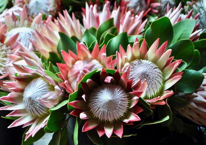 Adderley Street réserve son lot de (bonnes) surprises à ceux qui, comme moi, s'intéressent de près à l'architecture : je croiserai ainsi la Standard Bank (deuxième photo) dont le dôme est dominé par une statue de Britannia. La première pierre de cette très belle construction fut posée en 1880. Entre le quartier de Gardens et le Foreshore, je découvrirai Trafalgar Square et son charmant marché aux fleurs (troisième photo). Des fleurs, il y en a encore en ce début d'après-midi, toutes plus belles les unes que les autres, mais j'en recherche une en particulier, la protée (du nom Protea qui sera donné en 1771 à cette plante par Carl von Linné, à cause de la capacité de cette fleur de changer de forme et de couleur selon son espèce). Que croyez-vous qu'il advint ? Sous l'impulsion du gouvernement du parti de Nelson Mandela, à la fin de l'apartheid, il fut demandé aux sportifs sud-africains d'arborer une protée (deuxième photo ci-dessus) comme unique emblème national. A noter que la protée fait partie intégrante de la région floristique du Cap.