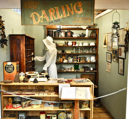 Une autre vitrine en impose, celle de l'épicerie (ci-dessous) General Dealers. Ce type d'établissement avait vu le jour aux 18è et 19è siècle, à un moment où l'on réclamait de plus en plus des biens importés. L'épicier, qui cernait au plus près les besoins de ses clients était en mesure de limiter ses stocks au maximum, et de maitriser ainsi ses couts pour mieux répondre aux demandes de chacun. Theodore Vollmer, toujours habillé impeccablement, sera non seulement un homme d'affaires influent de Darling mais aussi le propriétaire de l'épicerie générale du village en 1906. On trouvait de tout chez cet homme-là qui stockait un nombre important d'articles. Très aisé, Mr Vollmer possédait aussi le Oil & Plough Store (huile et outillage) et Grain Store (magasin à grains). Vingt ans plus tard, Darling comptait jusqu'à six magasins généraux pour cette seule commune. Plus modestement, Pieter Beziek sera colporteur de fruits et de légumes durant les années 1970 après avoir préalablement occupé un poste de contremaitre aux parcs et forêts sud-africains. Homme au grand cœur, il n 'hésitera jamais une seconde lorsqu'il s'agira d'aider les plus pauvres de la commune. La communauté juive, elle aussi, prendra toute sa place dans le développement économique du village durant le 20è siècle. De nombreuse familles, issues pour la plupart de Lituanie, s'illustreront dans le petit commerce, mais également comme hôteliers (Mr Barney Levy possédera le Royal Salt Pans, puis le Royal Hotel), ou comme tenanciers de magasins généraux.