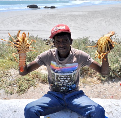 Finalement, je ne verrai de ce petit village de pêcheurs que...deux homards vaillamment brandis par un vendeur local. De beaux spécimens (les homards, pas le vendeur!) issus d'ne maman homard prolifique (une femelle peut pondre à elle seule près de 200000 œufs). Les œufs qui sont fertilisés sont alors logés dans la queue de l'animal, puis éclosent trois mois plus tard. Et ces bébés homards de survivre ensuite à l'air libre en se nourrissant de plancton les sept mois suivants, et en subissant treize métamorphoses durant ce laps de temps. A Paternoster, c'est du homard des rochers dont on parle, plus gouteux que son congénère européen, et aux pinces moins grosses. Les côtes sud-africaines ont chacune leurs homards. La côte Ouest abrite le homard de rocher, l'espèce la plus nombreuse, la côte Est, elle, abrite cinq espèces de ce crustacée, chaque espèce se distinguant par une couleur différente, mais les effectifs de ces cinq espèces sont beaucoup plus modestes. La côte sud et la mer du Natal possèdent ensemble deux espèces de homards de rocher vivant dans les eaux profondes. Ces animaux ne comptent que l'homme et le phoque comme prédateur une fois atteint l'âge adulte (un homard peut vivre plus de 50 ans!). En revanche, les jeunes homards se font dévorer par les poissons et les poulpes. Afin de préserver l'espèce, la pêche de ce crustacée est bien sûr réglementée et limitée à 2600 tonnes pêchées chaque année sur cette côte ouest (contre 800 tonnes le long du littoral sud). La préservation de l'espèce est à ce prix !