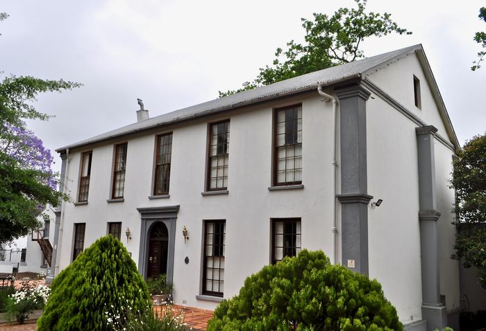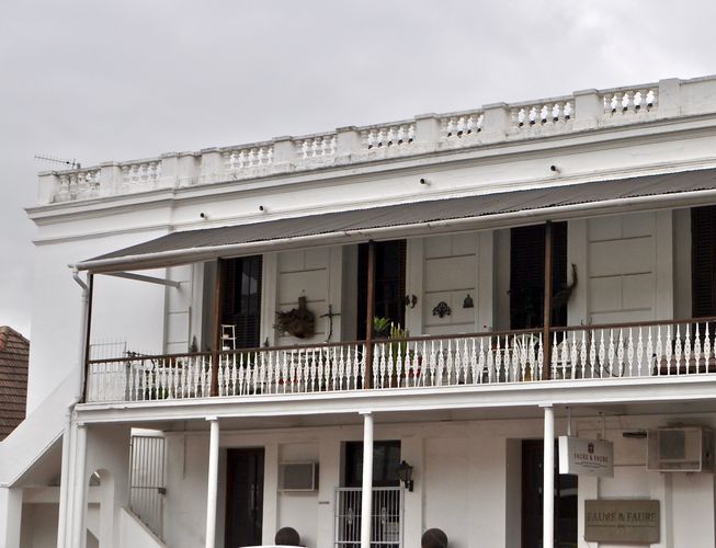 Notre promenade débute au N°112, en face de l'église Het Gesticht, de style Néo-gothique. Erigé en 1813 pour servir d'école et de lieu de rassemblement pour l'accueil des esclaves alors assistés par les Missionnaires, cet édifice passera sous la tutelle de la Société missionnaire de Paarl dès 1817, et jusqu'à ce qu'une plus grande église soit construite en 1841. Ce gothique Renaissance offre les habituels traits du gothique original, agrémenté d'autres motifs décoratifs. A quelques pas de là, sur le trottoir d'en face, s'élève la Klein Vredenberg, de style géorgien (ci-dessous). Cette architecture, née après la seconde vague d'occupation britannique, est le résultat de l'évolution des lois de l'époque, des matériaux de construction utilisés et des modes. Les maisons étaient souvent à deux niveaux et agrémentées d'un toit plat, et de fenêtres à guillotine. Construite au milieu du 19è siècle la maison ci-dessous offre une double porte d'entrée encadrée par deux pilastres cannelés. L'ensemble, probablement un ancien cottage en toit de chaume transformé en ravissante demeure géorgienne, fut acquis en 1823 par un certain I.P de Villiers.