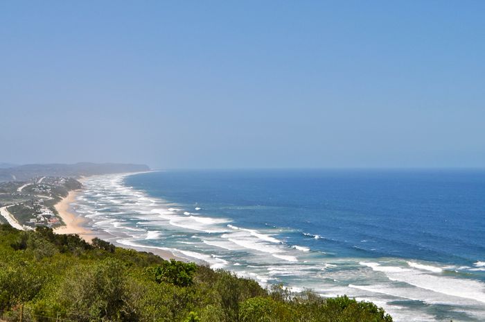 En revenant sur mes pas, je m'arrête en bord de route pour photographier les montagnes environnantes (ci-dessous) qui forment l'arrière-pays de Wilderness, à la fois rural et montagneux. Une riche flore (protées, orchidées...) s'y développe pour le plus grand plaisir des promeneurs. Car nous sommes ici sur la route des jardins et la nature offre à notre regard ce qu'elle a de meilleur : un littoral magnifique (deuxième photo) où il est malheureusement très risqué de se baigner à cause de puissants courants marins.
