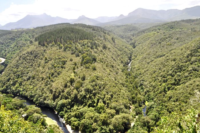 Il est temps pour moi de rentrer à George, par la route de la corniche qui offre au niveau d'un virage, Dolphin Point, une aire de stationnement (dans le sens de circulation Wilderness-George) permettant aux touristes de profiter d'un superbe point de vue. Nous sommes alors au col de la rivière Kaaimans, dont la route fut tracée en 1752. Le col, lui, culmine à 184 mètres, alors que le parking ne se trouve qu'à 67 mètres au-dessus du niveau de la mer. Ce col, qui relie George à Wilderness offre au passage de superbes paysages et le premier pont courbé d'Afrique du Sud qui fut érigé en 1952.