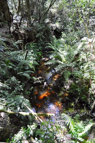 J'ai rarement vu dans ce pays un descriptif si détaillé avec d'aussi belles illustrations. Un panneau présente ainsi les animaux de la route des jardins dont le gros chat caracal, la chauve-souris, le cochon de brousse, le blaireau ou l'oriole à tête noire. Quant aux dessins, ils parleront davantage aux enfants qu'une photo. Je découvre au passage que la région sud du Cap offre la plus grande forêt (soit 60500 hectares) du pays, répartie sur une zone située au sud des chaines montagneuses de l'Outeniqua et de Tsitsikamma. Faune et flore se répartissent ainsi sur trois niveaux, depuis les pentes montagneuses les plus hautes, le littoral avec la forêt et les rivières en zones vallonnées. Un autre panneau s'intéresse aux différents peuples qui ont vécu dans cette région et ont façonné la nature telle qu'elle est aujourd'hui, comme les travailleurs forestiers, les guérisseurs, les fermiers et les jardiniers, les devins...Enfin, une courte histoire de la gestion de la forêt le long de la route des jardins est proposée, depuis la période pré-coloniale (avant 1700), l'arrivée des Néerlandais (1750-1855), la période instable entre 1812 et 1820, l'apparition de la gestion du domaine forestier en tant que tel (1856-1939), l'époque des bûcherons (1892-1939), la mise en place d'un système forestier reposant, sur la protection, l'exploitation des ressources et l'accès au grand public de cette forêt (1967-1983) et, depuis 1984, l'existence d'une gestion moderne du domaine forestier.