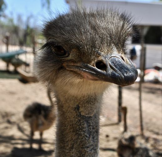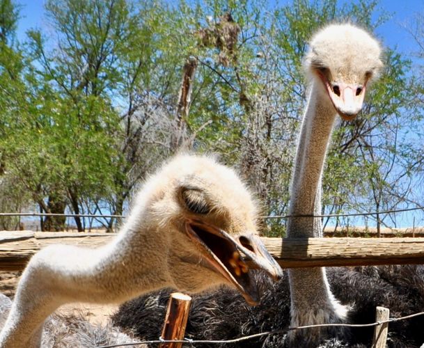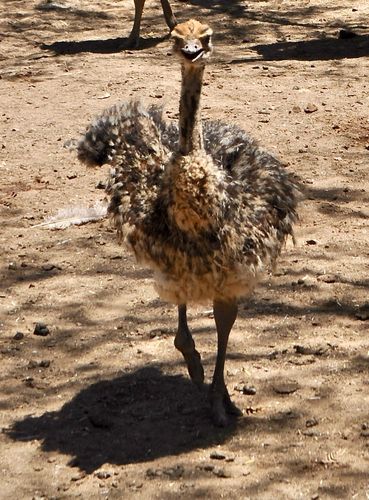 Ma guide a eu la bonne idée d'emporter avec elle un sachet de grains de maïs pour attirer les animaux du premier enclos auquel nous nous arrêtons. C'est aussitôt l'afflux d'autruches au pied du grillage, mais sans bousculade. Et l'oiseau de donner des coups de bec pour grappiller quelques grains de maïs. Aucun danger de morsure car l'autruche n'a pas de dents. Plus timides, les autruchons (bébés autruches, en deuxxième photo ci-dessous) venus au monde il y a juste huit semaines, s'approchent timidement. Dès quatre semaines, les jeunes présentent un duvet épineux chamois à pinceaux blancs avec des taches noires au cou, puis ressemblent ensuite à une autruche femelle. Le mâle, lui, a un plumage noir avec les extrémités des ailes et de la queue marquées de plumes blanches. Quant à la femelle, elle possède un plumage gris-brun et le dessous clair, allant du beige au blanc.