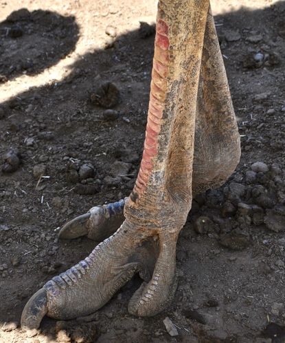 Avec ses 2,50 mètres de haut et ses 130 à 150 kg, l'autruche mâle est le plus grand et le plus lourd des oiseaux sur cette terre. Individu au corps massif, l'autruche possède des pattes longues et puissantes, avec seulement deux doigts par patte (photo ci-dessus), le doigt extérieur, plus petit, étant dépourvu de griffe. L'oiseau porte deux yeux de taille un peu démesurée par rapport à la taille de sa tête (ci-dessous) qui est portée par un long cou, mais ces yeux sont ornés de longs cils.