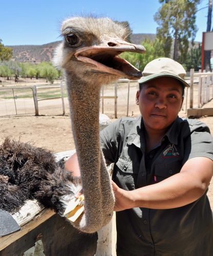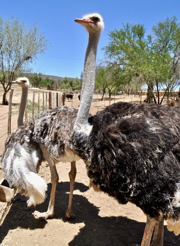 De passage à Oudtshoorn, je m'arrête dans l'une des 180 fermes d'autruches que compte la région. Cet oiseau m'interpelle. Son regard curieux de tout me laisse perplexe. S'intéresse t-il vraiment à ce qu'il voit ou son esprit de convoitise lui ordonne t-il de chaparder ce que je transporte ? Durant la visite, une autruche donnera un coup de bec à mon appareil-photos. Voulait -elle un selfie ? Je lui répondis que c'était du matériel japonais, et du costaud. Peu lui importe car cet animal a un estomac d'autruche qui peut tout digérer, ou presque. Je ne me cacherai pas la tête dans le sable comme l'autruche, cette phrase connue qui, d'après ma guide, s'apparente davantage à une légende qu'à la réalité. Ce qui est vrai, c'est que cet oiseau n'a pas de mémoire et que le mâle n'est pas (forcément) plus fidèle que (certains) hommes, draguant tour à tour plusieurs femelles. Tiens donc …