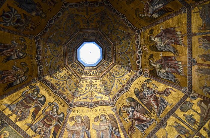 Le baptistère, lui, se dresse un peu à l'écart de la cathédrale sur d'anciennes constructions romaines du 1er siècle, même si sa construction initiale remonte au 4è siècle. Le bâtiment reste néanmoins l'un des plus vieux de la cité florentine. Rebâti sur un plan octogonal, revêtu de marbre blanc à l'extérieur et coiffé d'un toiture pyramidale, le site deviendra officiellement baptistère en 1128. L'ensemble offre mosaïques de style byzantin sur les parois, un plafond remarquable (ci-dessous) représentant un Christ du Jugement dernier et des panneaux de l'Ancien Testament et du Nouveau Testament ainsi que la vie de Jean le Baptiste. L'édifice est doté de trois portes de bronze ornées de bas-reliefs (dont les originaux sont désormais conservés au musée du Duomo)