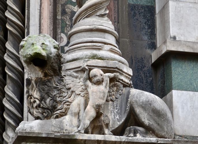 Le lion mortel (ci-dessous) se trouve quant à lui au niveau d'un portail latéral, sur le flanc gauche de la cathédrale, portail encadré par deux colonnes soutenues par un lion et une lionne. Et la porte de Balla ou des Cornacchini de devoir son nom à une tragique histoire : Au 15è siècle, Anselme, alors voisin de la famille Cornacchini se vit dévoré par un lion identique à celui des deux colonnes, lors de son sommeil. Afin d'exorciser son cauchemar, le pauvre homme mit la main dans la gueule du lion sculpté dès le lendemain. Malheureusement, un gros scorpion, qui avait élu domicile à cet endroit piqua Anselme qui décéda le même jour.