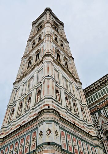 Des fouilles entreprises sous l'église Santa Reparata permettront de retrouver les reliques du vénéré évêque de Florence Saint Zénobe, en 1330. C'est alors Giotto di Bondone qui prend la direction des travaux quatre ans plus tard. Lequel portera ses efforts sur la campanile en fournissant un premier croquis. L'homme en lancera la construction mais n'en verra jamais l'aboutissement puisqu'il mourra en 1337. Tour campanile de la cathédrale, l'édifice sera finalement achevé par Francesco Talenti en 1349, à qui l'on doit sa forme actuelle et sa stabilité confortée par les pilastres offrant de grandes ouvertures. Loin des 115 mètres initialement prévus par son créateur, le campanile mesure plus de 84 mètres de haut et est composé de bas en haut, d'un soubassement orné de médaillons hexagonaux, puis de losanges représentant des figures symboliques, puis, au deuxième étage, de niches agrémentées de statues, les trois derniers étages étant équipées d'ouvertures géminées. La terrasse du sommet est accessible par un escalier de 416 marches, mais celle-ci est malheureusement grillagée ce qui ne facilite pas la prise de photos. Quant aux cinq niveaux de l'édifices, ils sont recouverts de marbres polychromes (tout comme d'ailleurs le corps de la cathédrale et le baptistère Saint Jean-Baptiste), dont du marbre blanc de Carrare, du vert de Prato, du rose de Maremme et du rouge de Sienne.
