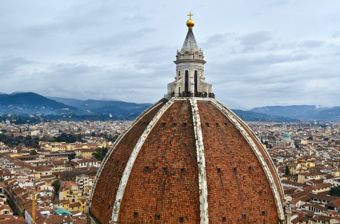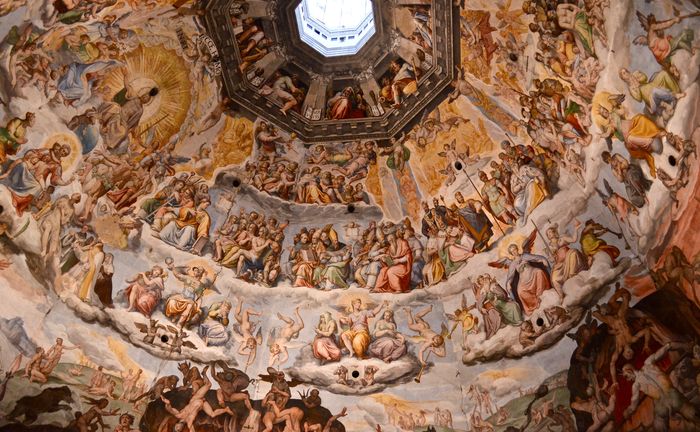 Reste le dôme, autre défi de taille. En 1418, un concours public sera lancé pour ce projet. Même si personne ne remportera le prix final de cette compétition, un candidat se détachera du lot, en la personne de Filippo Brunelleschi qui oeuvrait déjà à l'époque à la construction d'un modèle similaire pour le compte de l'Opéra del Duomo. Et Brunelleschi de s'inspirer de la coupole du Panthéon antique érigé à Rome en l'an 27 avant JC pour construire le dôme, à l'aide de nervures de pierres et anneaux de maçonnerie de briques. Savant mélange de génie et de technique à l'épreuve du temps ! L'intérieur de la coupole, d'abord recouvert de blanc, sera plus tard orné d'une gigantesque fresque en mosaïque dorée, représentant le Jugement dernier. Oeuvre grandiose ! L'ascension du dôme mérite d'être faite même si les escaliers sont étroits par endroits et si de hautes vitres de verre viennent partiellement masquer la vision de cette fresque magnifique.