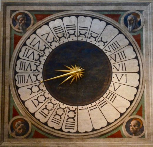Un autre homme, Paolo Uccello, mit son talent au service du temps en peignant sur la grande horloge installée à l'intérieur du Duomo et au-dessus de la porte principale un grand cercle sur lequel figurent les 24 heures de la journée, en respectant la séquence caractéristique de l'époque, c'est à dire dans le sens contraire des aiguilles d'une montre et en partant du bas. La première heure était celle qui suivait le coucher du soleil et la 24è, celle de l'Ave Maria du soir. Et l'horloge du Duomo de scander ainsi la vie civile et religieuse de Florence en dépit de l'absence de cloches et en n'utilisant...qu'une seule aiguille !