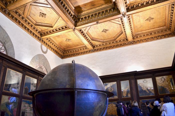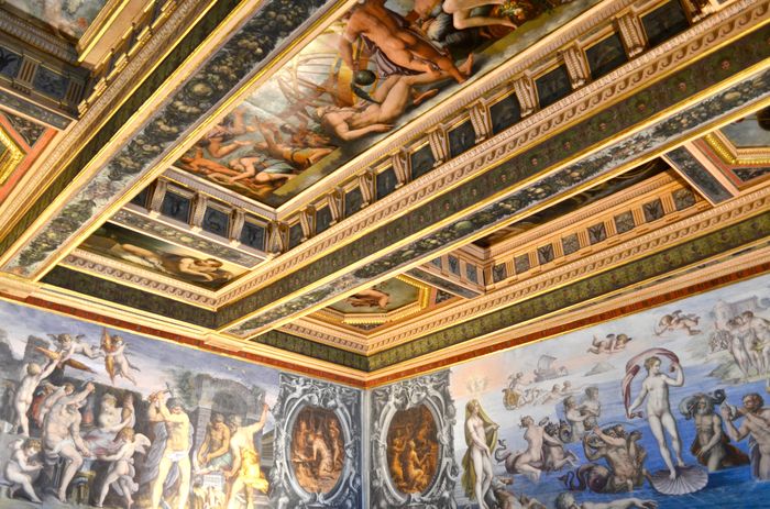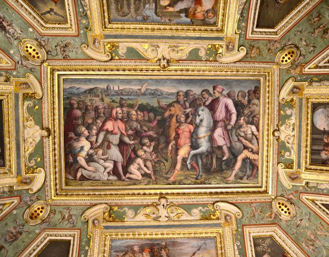 Au deuxième étage, se trouve la salle des Lys, cette fleur symbolisant alors l'alliance traditionnelle entre la France et Florence, tout particulièrement avec les Médicis. Louis XI n'avait-il pas octroyé à Pierre de Médicis le privilège de faire figurer trois fleurs de lys sur le blason familial, en mai 1465 ? D'autres pièces occupent enfin ce même étage, comme la Chancellerie et l'appartement des Éléments (deuxième photo), la salle d'Audience, la Chapelle de la Seigneurie, l'appartement d’Éléonore de Tolède (avec sa chapelle, voisine de la chambre verte, et dont le plafond est orné des fresques d'Angelo Bronzino), la Salle de Gualdrara, la Salle des Cartes géographiques (troisième photo) et le Studiolo. Pour ce genre de visite, il est fortement conseillé de porter son regard vers le haut, compte tenu de l'extrême beauté des plafonds !