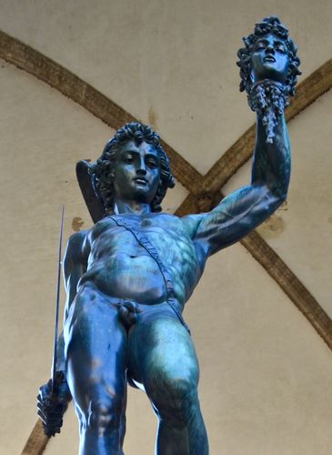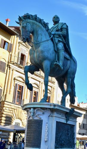 Ne manquons pas la réplique en marbre du David de Michel-Ange ou Persée tenant la tête de Méduse, de Cellini. Ou encore la statue équestre du grand duc Cosme 1er de Toscane, œuvre de Jean Bologne, sculpteur maniériste d'origine flamande, né à Douai (alors en Flandre romane) en 1529. Au sujet de Cellini, on parle d'une œuvre double concernant la statue de Persée. Côté face, un regard fier d'exposer la tête sanglante de Méduse et de l'autre...on peut observer (à condition de regarder très attentivement) sur la partie postérieure de l'oeuvre, un relief très sophistiqué de muscles qui dessine le visage d'un homme, à la jointure de la nuque. Il s'agirait ni plus ni moins que l'autoportrait de Cellini, avec une grimace qu'on n'aurait jamais accepté sur une statue monumentale. Toutes ces sculptures ne sont-elles pas un hymne à la beauté ?