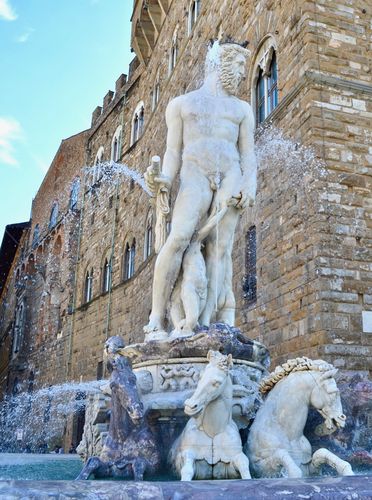 La Fontaine de Neptune (en photo ci-dessous) vaut le coup d'oeil : œuvre de Bartolomeo Ammannati et de certains de ses élèves, cette fontaine fut construite pour le mariage de François 1er de Médicis et de la Grande-duchesse Jeanne d'Autriche en 1565. On reconnaitra les traits de Cosme 1er de Médicis dans le personnage de Neptune, qui fait référence à la puissance maritime de Florence. L'influence du maniérisme est patente dans le style de cette fontaine, grâce à la présence de chevaux marins, de satyres en train de danser et de divinités fluviales. Ladite fontaine en vit de toutes les couleurs depuis sa création, servant tour à tour de lavoir au 16è siècle (de fortes amendes étaient pourtant prévues pour les contrevenants venant rincer leur linge sur place ou y déposer des saletés) , puis vandalisée en 1580, avant qu'un satyre ne soit dérobé lors du carnaval de 1830 et qu'un bombardement ne la détruise partiellement en 1848 durant le conflit avec les Bourbons.