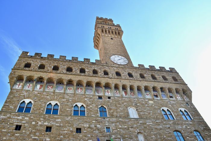Le Palazzo Vecchio qui domine la place de la Seigneurie est en quelque sorte l'hôtel de ville de Florence. Voisine des Offices, cette forteresse, à la fois élégante et imposante, est un concentré d'architecture du 14è siècle et portera plusieurs noms dont celui de Palais ducal, jusqu'à ce que ses souverains, les Médicis, ne s'installent au Palais Pitti. Néanmoins, son premier nom fut le Palazzo della Signoria (Palais de la Seigneurie) car c'est là que siégeait le gouvernement de commune.
