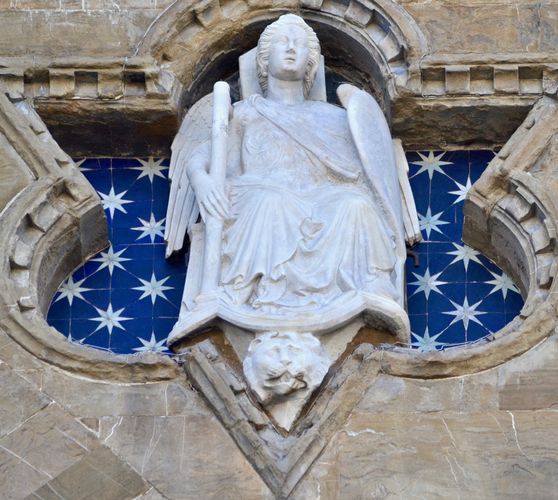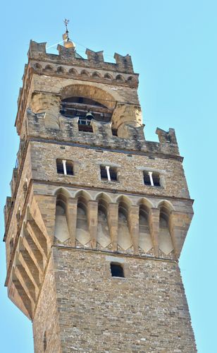 Il faudra 23 années pour aboutir à ce résultat puisque la première pierre du Palazzo Vecchio sera posée en 1299 en présence de l'architecte Arnolfo di Cambio, auteur du Duomo et de l'église Santa Croce, à une époque où la cité cherchait à montrer sa force et à garantir sa sécurité. Erigé sur les ruines du Palazzo dei Fanti et du Palazzo dell'Esecutore di Giustizia, le projet d'Arnolfi di Cambio s'appuiera sur la tour antique des familles Vacca et Bizzo pour structurer la façade de l'édifice. Cela explique pourquoi ladite tour n'est pas au centre du palais. Celle-ci, haute de 94 mètres, abrite deux petites cellules dont on aperçoit les petites fenêtres. C'est que l'endroit, qui servit un temps de prison , détint Cosme l'ancien et Jérôme Savonarole. Tour de guet, la construction est un beffroi de style typiquement toscan, qui doit son horloge d'origine à Donatello, laquelle sera remplacée en 1667 par celle de Vincenzo Viviani. La triple rangée de créneaux carrés de type guelfe intègre un chemin de ronde en saillie, tandis qu'une girouette en forme de lion coiffe son sommet. Le chemin de ronde en question fut récemment rouvert au public. Son architecture unique n'a subi aucune modification depuis sa construction au Moyen-Âge et reste conforme au plan d'Arnolfo di Cambio. Le long de ce chemin, j'observerai les mâchicoulis par lesquels était jetée l'huile bouillante sur les assaillants. Une vue impressionnante nous est ainsi offerte à plus de quarante mètres de hauteur sur la Place de la Seigneurie.