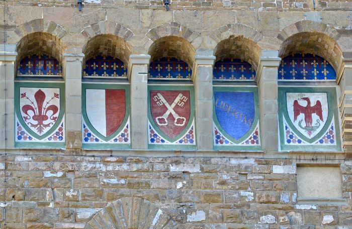 La façade principale du palais offre une série de blasons réalisés en 1353, blasons donnant un aperçu de la situation politique de la ville durant les 13è et 14è siècle. On y retrouve bien sûr l'emblème historique de la ville , le champ vermeil au lys blanc, puis un second blason de la ville symbolisant la population florentine après la destruction de Fiesole, ennemi séculaire de Florence jusqu'en 1125. En troisième position arrive le champ blanc au lys vermeil, aujourd'hui symbole de la cité et blason du parti guelfe, parti qui fut exilé par les Gibelins (partisans de l'empereur) en 1260. Le quatrième blason fait référence à 1289, année de prise de contrôle des organes du gouvernement par les corporations qui ne tarderont pas à émettre des Ordonnances de justice (en 1293) aboutissant au départ de certaines familles nobles jugées trop turbulentes. Le cinquième blason, lui, est celui de la seigneurie, avec l'inscription libertas (un des leitmotiv de la politique des communes italiennes alors constamment en guerre pour garantir leur indépendance et leur liberté). Cette série est complétée par d'autres blasons, clefs d'or et aigle rouge.
