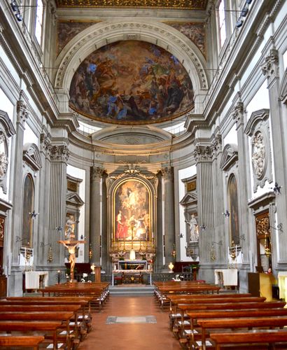 Je reviens bientôt sur mes pas, emprunte la Via della Ninna en direction de la Piazza di San Firenze, place en forme de trapèze occupée à l'est par l'église Saint Philippe Néri (édifice baroque ayant accueilli les Frères Philippins et dont le plafond est orné de peintures, en photo ci-dessous) avec, au-dessus d'une volée de marches, une façade qui ne fut achevée qu'en 1772, après cinq années de dur labeur. Non loin de là se dresse le Palais Gondi, conçu par Sangallo à la fin du 15è siècle mais non accessible au public. On dit aussi que ce palais date du Quattrocento, c'est à dire du 15è siècle italien, siècle de la première Renaissance, et mouvement qui amorce le début de le Renaissance en Europe. En peinture, on rompt alors avec le goût byzantin tandis que survient à Florence et dans d'autres villes d'Italie un bouillonnement culturel touchant le monde des arts. La cité florentine n'est pas en reste puisque Cosme 1er de Médicis concourra au mécénat d'artistes majeurs comme Paolo Uccello ou Fra Angelico qui participeront à l'Ecole florentine. Sur cette même place, le palais de justice occupe un grand édifice de style baroque situé juste en face.