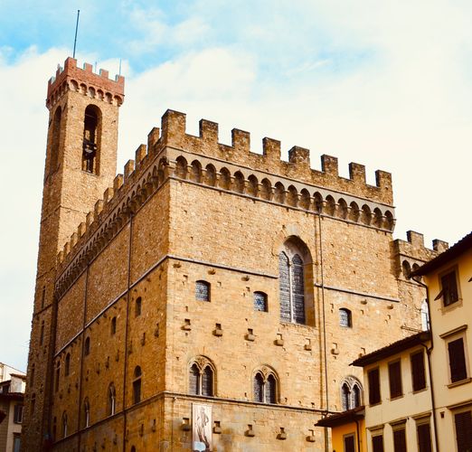 De là où je suis, j'aperçois au loin la tour de la Badia Fiorentina, l'une des plus anciennes églises de la ville. L'endroit abrite plusieurs fresques représentant la vie de Saint-Benoit (ci-dessous) qui sont visibles dans la galerie supérieure du cloitre des orangers. Ces fresques sont l'oeuvre de Jean de Consalvo, peintre portugais et compatriote de Gomezio, alors abbé de l'endroit. Juste en face, la masse imposante du bâtiment me permet de reconnaître aisément le Musée Bargello (deuxième photo ci-dessous), qui fut jadis utilisé comme prison. Construit dès 1255, ce palais abritera au Moyen-Âge le podestat, magistrat alors garant de la paix civile. Plus tard, l'ensemble deviendra prison (au 16è siècle) et siège du capitaine des sbires (bargello) avant d'être reconverti en musée en 1865 et de former ainsi l'un des premiers musées nationaux italiens, renfermant de surcroit une superbe collection de sculptures Renaissance et des bronzes maniéristes.