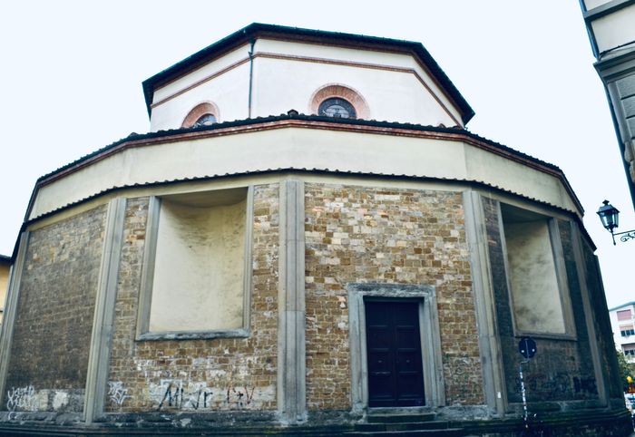 Après avoir gravi les (plus de) 400 marches du campanile del Duomo et avoir ainsi profité d'une vue panoramique en son sommet, j'emprunte la Via dei Servi, au N° 10 de laquelle se trouve le Palazzo Niccolini , doté d'une façade Renaissance typique conçue au milieu du 15è siècle. De nos jours, l'endroit accueille un hôtel mais en poussant la porte principale, vous en découvrirez la cour, le jardin et sa double-loggia. Un peu plus haut, je m'engage dans la Via degli Alfani où apparaît la Rotonda di Santa Maria degli Angeli, œuvre de Brunelleschi. Plus couramment surnommée Rotonde de Brunelleschi (deuxième photo ci-dessous), cet édifice est l'église de Sainte-Marie-des-Anges, ancien couvent florentin laissé aujourd'hui à l'état d'abandon. Fondé en 1295 par Antonio Viva Guittone d'Arezz, ledit couvent s'inspirera de l'ordre camaldule. En 1434, l'architecte Brunelleschi en réalisera l'église (ci-dessous) de forme octogonale, qui sera le premier bâtiment de la Renaissance à plan centré.