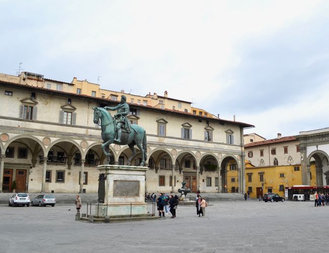 pour découvrir la loggia et l'hôpital des Innocents, encore une œuvre de Brunelleschi. La place en question est l'une des plus belles de la ville même si le projet initial ne put être mené complètement à son terme. Ammannati y érigera le Palazzo Grifoni (deuxième photo ci-dessus) entre 1557 et 1563, dont le premier étage offre un joli petit arc de triomphe maniériste. Quant à la statue de Ferdinand 1er, une des dernières œuvres de Jean de Bologne, elle fut achevée en 1608 par son assistant Pietro Tacca, qui créera les deux fontaines en bronze ornant la place. Si vous le pouvez, venez ici le 25 mars, pour assister à la fête de l'Annonciation et dégustez les biscuits brigidini vendus par les marchands pour l'occasion.