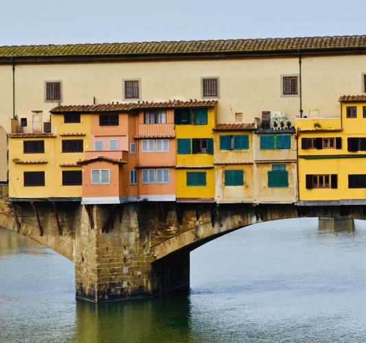 Notre parcours débute au centre du Ponte Vecchio où les échoppes d'alimentation qui s'y établirent au 13è siècle laissèrent la place aux orfèvreries trois siècles plus tard. Bâti en 1345, le Ponte Vecchio est sans aucun doute le plus ancien pont de Florence. Convoité depuis l'origine par les échoppes mais également par bouchers, tanneurs et forgerons qui trouvaient l'Arno bien pratique pour se débarrasser de leurs déchets, ces derniers en seront chassés en 1593 par Ferdinand 1er indisposé par leur vacarme et leur pestilence. Et de les remplacer par des joailliers et des orfèvres, une tradition qui perdure encore de nos jours. Un buste sculpté sur place ne représente t-il pas Benvenuto Cellini, l'orfèvre le plus célèbre de son temps ? En observant attentivement sur le côte est le corridor de Vasari avec ses fenêtres circulaires, on imagine l'idée géniale qu'eut l'architecte Georgio Vasari lorsqu'il conçut ce couloir surélevé (aussi appelé couloir du prince) reliant le Ponte Vecchio au Palazzo Pitti en traversant les Offices pour permettre aux Médicis de circuler sans encombres entre leurs résidences et sans se mêler à la foule.