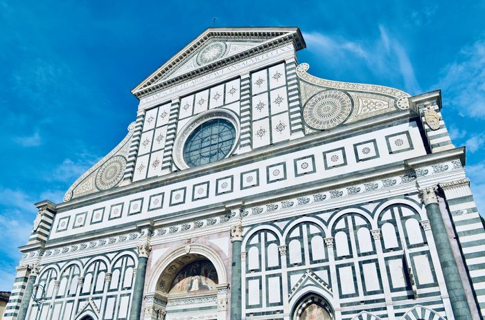 Prenons maintenant la Via de Gori jusqu'à l'église San Lorenzo et les tombeaux des Médicis. Brunelleschi débuta la construction de cette église en 1424 et en fit un joyau de la première Renaissance, sur l'emplacement d'un sanctuaire roman du 11è siècle. Les plus grands artistes participeront à sa décoration ainsi qu'à celle des chapelles des Médicis. Quant aux tombeaux, Michel-Ange les orna de quatre puissantes allégories du Jour, de la Nuit, du Crépuscule et de l'Aurore. J'emprunte ensuite la Via del Melarancio, puis je traverse la Piazza dell'Unita Italiana, la Via Panzani avant d'atteindre la Piazza di Santa Maria Novella, qui marque le terme de cette balade. Construite par les dominicains de 1279 à 1360, l'église gothique (deuxième photo) qui s'y trouve reflète par sa simplicité et l'usage de marbres polychromes une adaptation florentine du style cistercien importé de Bourgogne (France). Et les œuvres qui s'y trouvent d'en faire un véritable musée où se mêlent gothique et Renaissance. Un ancien cimetière a lui aussi conservé ses niches funéraires.
