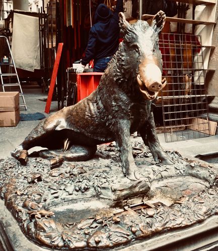 J'emprunte maintenant la Via Por Santa Maria, tandis que se dressent sur ma droite le Vicolo Santo Stefano et l'église Santo Stefano al Ponte actuellement fermée pour travaux. Plus loin, je marquerai une pause devant le Mercato Nuovo (ci-dessus) érigé en 1551 par Battista del Tasso. Cette loggia du Marché neuf avait alors pour vocation d'abriter les étals des marchands de soieries et de produits de luxe. L'endroit est aussi surnommé le Marché de paille car on vend ici, et depuis le 19è siècle toutes sortes d'articles de vannerie, depuis les chapeaux jusqu'aux meubles. Au sud de ce marché coule la fontaine del Porcellino (ci-dessous), fièrement ornée d'une copie en bronze d'un marbre romain des Offices qui représente un sanglier. On doit cette œuvre à Pietro Tacca. La tradition veut qu'on caresse le museau de l'animal et qu'on jette des pièces dans le bassin, ce qui assure à la personne de revenir un jour à Florence. Les promesses n'engageant que ceux qui y croient, soyez rassurés car les pièces du bassin sont récupérées puis offertes à des œuvres caritatives.