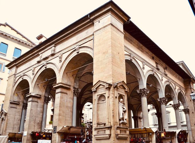 Le charme toscan vient entre autres du nombre de bâtiments gothiques et Renaissance qui ont subsisté. Il en va ainsi de Florence, dans le quartier du Mercato Nuovo où des rues entières sont restées pratiquement identiques depuis le 16è siècle. On s'en rend compte en observant le détail des fenêtres. Brunelleschi sera ainsi inspiré par la simplicité des édifices de la Rome classique lorsqu'il dessina la loggia du Spedale degli Innocenti (Hôpital des Innocents), la première de ses oeuvres architecturales de style Renaissance. Et ses concitoyens d'adopter spontanément ce style élégant, considérant leur cité comme une « nouvelle » Rome. Et Vasari de célébrer le génial architecte que sera Filippo Brunelleschi en écrivant « qu'il nous fut envoyé par le ciel pour donner une nouvelle forme à l'architecture ». De fait, entre 1420 et 1446, l'oeuvre de Brunelleschi se situe comme un moment décisif dans l'histoire de l'architecture et de la forme urbaine à Florence, à un moment où la cité avait déjà tracé les limites de son périmètre. A la fois architecte, mathématicien, géomètre, peintre, sculpteur, et concepteur de nouvelles machines, l'homme apparaissait comme universel. Ce personnage était à la fois capable de maitriser l’ingénierie militaire, navale et hydraulique et d'inventer spectacles et instruments de musique. Il est vrai qu'il avait profité d'un climat exceptionnellement riche en ferments culturels issus de cette première génération qui avait fait éclore la Renaissance florentine.