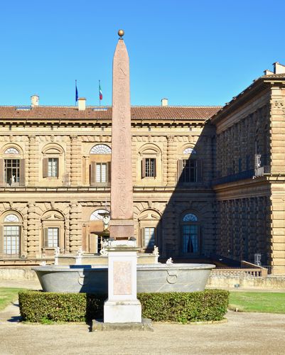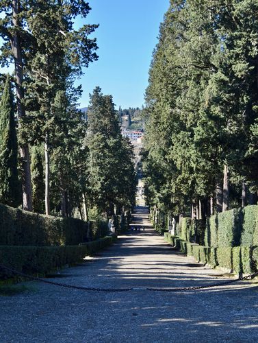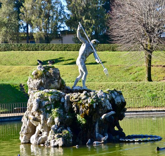 Je franchis depuis la façade arrière du palais l'allée principale rectiligne qui monte sur la colline de Boboli, en traversant un amphithéâtre au centre duquel se dresse un obélisque égyptien transporté depuis la Villa Médicis de Rome. Cet obélisque fut jadis devant le temple de Rê (Héliopolis) avec son frère jumeau, l'obélisque du monument de Dogali (Rome). Poursuivant inlassablement ce qui s'apparente à une ascension, j'atteindrai au final la fontaine de Neptune où la sculpture de Stoldo Lorenzi se détache sur le panorama.Une fois arrivé au sommet de la colline, tout près du Forte Belvedere, on découvre une vue imprenable sur Florence et les alentours, telle que le peintre Corot l'avait décrit en 1834 dans son œuvre picturale. Après une courte pause, j'emprunte une allée secondaire qui m'entraine vers une série de terrasses et de fontaine, le Viottolone, surnommée allée des Cyprès, une allée qui me conduire à l'Isolotto (petite île). Petit bémol cependant, il faut avoir un sacré sens de l'orientation pour trouver son chemin dans certaines allées de ce parc où l'on ne trouve aucune indication.
