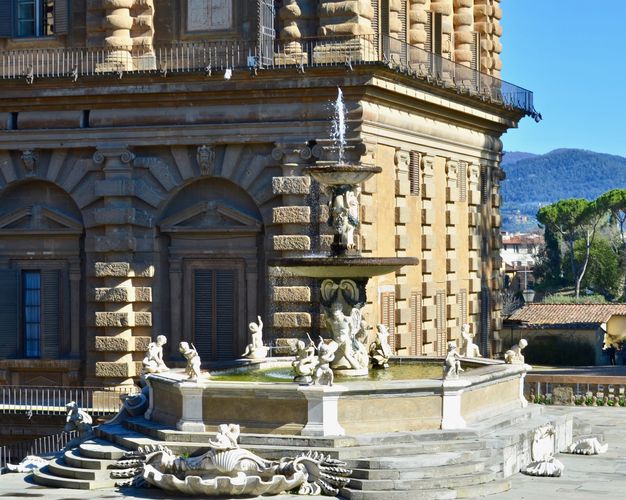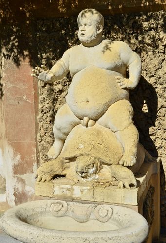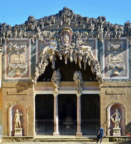 A ne pas manquer : la Lunette des jardins de Boboli, en photo ci-dessous, qui fut peinte par le flamand Justus Van Utens en 1599. Autre grotte, la Grotta Grande (ou grotte de Buontalenti et deuxième photo), qui fut commanditée par le grand-duc de Toscane François 1er de Médicis et reste un chef d'oeuvre d'architecture maniériste. Avant 1924, y figuraient les originaux de quatre sculptures d'esclaves, depuis transférés à la Galleria dell'Academia de Florence. Non loin de là, il faut admirer la fontaine de Bacchus (troisième photo), œuvre de Valerio Cioli réalisée en 1560. L'auteur donna au dieu romain du vin les traits de Pietro Barbino, nain de la cour de François 1er.