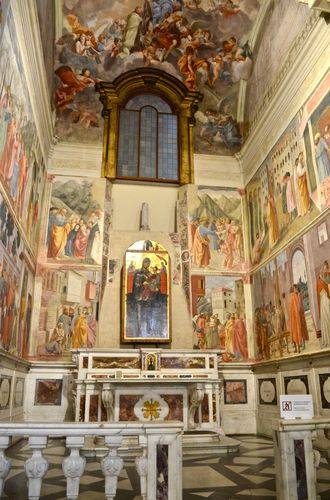 Je me rends maintenant à la billetterie située dans le cloitre et je me retrouve quelques instant plus tard face à la chapelle qu'on m'avait déjà décrite. Fondée en 1386 par le riche drapier Pieri di Piuvichese Brancacci afin d'y honorer Saint Pierre, son saint patron, la chapelle sera érigée dans le style Première Renaissance. Une trentaine d'années plus tard, son neveu Felicie di Michele Brancacci commandera la décoration peinte de l'endroit à Masolino da Panicale. Le peintre aura juste le temps de débuter les travaux en 1424 car il partira en Hongrie peu de temps après, et pour trois années, pour se mettre au service d'un certain Filippo Buondelmonti Scolari (alias Pippo Spano), condottiere italien, chef militaire de Hongrie et grand combattant des turqueries en tous genres. A son retour à Florence en 1427, Masolino se fera aider par son élève Masaccio pour la réalisation des peintures, avant de repartir encore un an plus tard, toujours avec Masaccio et à Rome cette fois, afin de réaliser la décoration de la chapelle du Sacrement de la basilique Saint Clément, commandée par Branda Castiglione. Masaccio quittera mystérieusement ce bas-monde durant son séjour romain, et laissera Masolino poursuivre seul le travail jusqu'en 1432, date à laquelle il sera rejoint par Filippino Lippi qui terminera les fresques de 1480 à 1485.