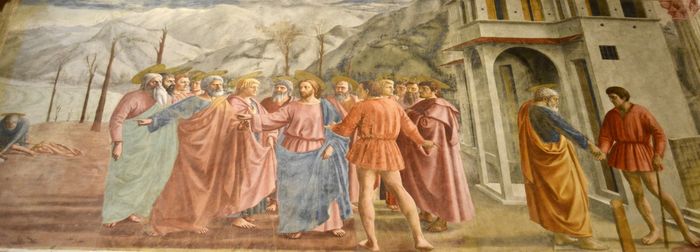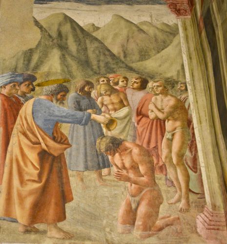 Quant à la vie de Saint Pierre, elle est composée de plusieurs peintures : plusieurs fresques supérieures décrivent ainsi le paiement du tribut (œuvre de Masaccio) en photo ci-dessous. Cet épisode tire son inspiration de l'Evangile selon Saint Matthieu. On aperçoit ensuite la Prédication de Saint Pierre (œuvre de Masolino) et le Baptême des néophytes (deuxième photo ci-dessous) que l'on doit au même artiste. Enfin, deux dernières œuvres : L'ombre de Saint Pierre guérit les infirmes et Saint Pierre ressuscite Tabitha, œuvres conjointes de Masolino et Masaccio.