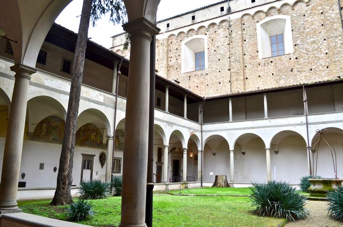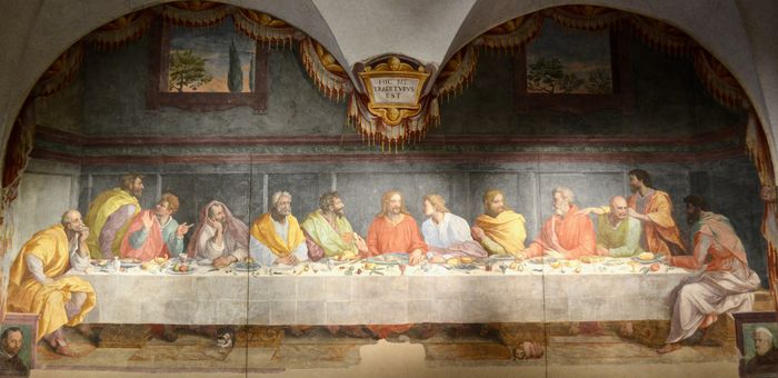 Quelques instants plus tard, je quitte l'église pour prendre l'entrée sur ma gauche, celle qui va me conduire jusqu'à la chapelle Brancacci, en traversant un cloitre (ci-dessous). Couvent et cloitre s'élevaient déjà ici dès le 17è siècle, et l'ensemble, doté d'une loggia double, sera reconstruit de 1597 à 1612. Une courte promenade me permettra de repérer sur les murs les blasons de familles médiévales originaires des alentours proches de l'Oltrarno. Soudain, je remarque qu'une salle est ouverte. Il s'agit en fait d'un des deux anciens réfectoires qui abrite désormais une fresque représentant Le dernier souper (deuxième photo), une œuvre réalisée en 1582 par Allesandro Allori.