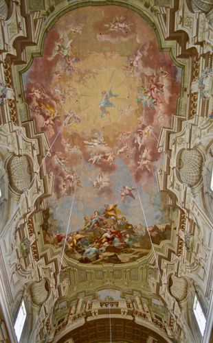 La chapelle Brancacci traversera bon an mal an les 17è et 18è siècles en vivant l'engouement pour la sculpture durant les années 1670, une mode qui lui vaudra l'installation d'une balustrade et d'un nouvel autel pour accueillir...La Madonna del Popolo (La Madone du Peuple). Puis les Quatre évangélistes précédemment peints par Masolino sur les voûtes de l'édifice seront remplacés par une fresque de Vincenzo Meucci (ci-dessous) entre 1746 et 1748. D'autres fresques du pauvre Masolino, sur les tympans cette fois, seront également recouvertes pour y poser d'autres peintures. Heureusement, l'incendie qui endommagea l'église en 1771 n'endommagera que très légèrement la célèbre chapelle.