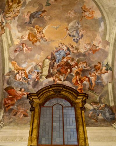 Florence, en 1268 : l'Eglise Santa Maria del Carmine est née. Elle ne le sait pas encore mais ses charpentes et bon nombre de ses trésors partiront en fumée en 1771, à l'exception de la sacristie, du transept et des chapelles Corsini et Brancacci. Tiens donc! Serait-ce un signe du destin envers cette chapelle qui attire tant de visiteurs du monde entier ? Pour l'heure, je me suis réfugié à l'intérieur de l'église dès la tombée des premières gouttes de pluie. J'aime observer les plafonds des édifices religieux car ils nous réservent souvent des (bonnes) surprises. Celui de cette église est une voûte en trompe l'oeil (en photo ci-dessous), œuvre conjointe de Domenico Stagi et de Giuseppe Romei.