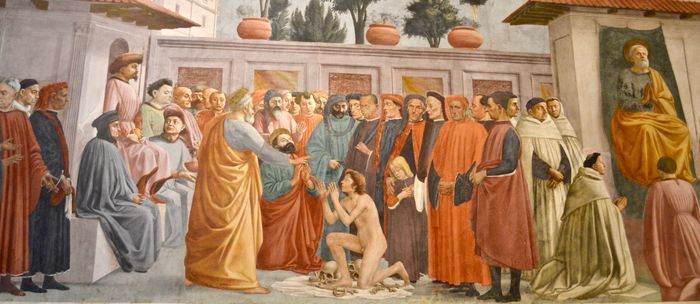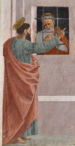En 1434, Felicie Brancacci sera banni de Florence avec d'autres opposants à Cosme de Médicis, tout juste dix ans après avoir passé commande des fresques de la célèbre chapelle. Et La Madonna del Popolo, panneau du 13è siècle d'être bientôt installée de manière forcée, faisant de la chapelle un édifice désormais consacré à la nouvelle Madone! La reprise des travaux en 1480 imposera à Filippino Lippi d'effacer les anciens portraits des Brancacci déjà insérés sur les fresques, puis d'en repeindre de nouveaux à la place. Artiste talentueux, Lippi peindra merveilleusement les trois fresques du cycle consacré à la vie de Saint Pierre, à savoir la Résurrection du fils de Théophile (commencée par Masaccio et en photo ci-dessous), la dispute avec Simon le magicien, la visite de Saint Pierre par Saint Paul en prison et la libération de Saint Pierre par l'ange. Prolifique, ce même artiste exécutera d'autres commandes au cours des années 1480, comme par exemple le retable de la chapelle Saint Bernard du Palais Vecchio, ou la décoration de la chapelle funéraire de Filippo Strozzi à l'intérieur de l'église Santa Maria Novella. Un détail cependant: lors de la réalisation de « la Dispute avec Simon le Magicien », notre homme glissera son autoportrait en tant qu'homme dans la foule.