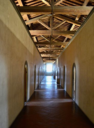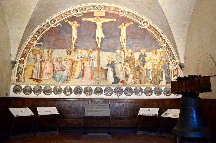Je débute ma visite par l'ancien hospice des Pèlerins qui renferme de nombreuses peintures de Fra Angelico et de son atelier. Les Dominicains avaient en effet souhaité que les différents endroits du couvent soient décorés par des fresques ayant valeur de symbole. La réalisation de ces peintures sera ainsi confiée en 1438 au frère dominicain Giovanni da Fiesole (alias Fra Angelico), lequel ornera de ses œuvres lieux de passage et cellules des frères. Un couloir d'accès donnant sur le cloitre me permet ensuite de me rendre au Grand réfectoire. Il est fortement conseillé de lever le regard vers le plafond car les voûtes d'arêtes formant ce promenoir offrent entre autres, cinq lunettes qui comportent les fresques les plus anciennes de Fra Angelico.