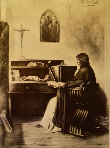 Le premier étage abrite le dortoir des moines et la grande bibliothèque. Chaque cellule comporte une ouverture donnant pour les fenêtres sur le cloitre de Saint Antonin et pour les portes sur l'un des couloirs Nord, Sud et Est. Vides, ces cellules sont néanmoins ornées d'une œuvre de Fra Angelico, la première d'entre elles étant la célèbre Annonciation, un des thèmes de l'iconographie chrétienne touchant à la représentation artistique de la Vierge Marie. Je ferai ainsi le tour de dizaines de cellules et admirerai au passage chacune des compositions du peintre dominicain. A la fin d'un long couloir, j'aperçois la cellule de Savonarole (deuxième photo), constituée en réalité de trois pièces. Plusieurs objets lui ayant appartenu sont placés sous vitrine tandis qu'une représentation du condamné subissant le bûcher sur la Place de la Seigneurie est accrochée au mur. C'est que Savonarole n'était pas un tendre. Frère dominicain, prédicateur et réformateur italien, il mettra sur pied, puis dirigera la dictature théocratique de Florence de 1494 à 1498. On retiendra de son programme les réformes religieuses, ses prêches anti-humanistes, et son bûcher des vanités (lieu de destruction par le feu de milliers d'objets supposés pousser au péché, comme des miroirs, des cosmétiques des robes ou des bijoux...) qui n'était pas une invention de Savonarole car ce bûcher était fréquemment utilisé lors des sermons durant la première moitié du 15è siècle. Notons enfin ses prêches véhéments contre la corruption morale du clergé catholique.