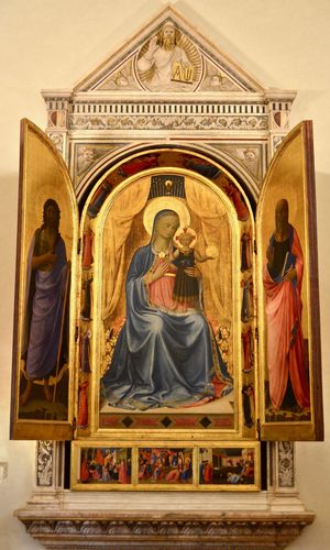 L'endroit paraît d'abord austère face au ciel pluvieux qui plane au-dessus de Florence. L'ensemble abrite pourtant la grande majorité des chefs-d'oeuvre de ce peintre dominicain, Fra Angelico. Connu sous plusieurs noms, les Italiens le surnommeront volontiers Beato Angelico (Bienheureux Angelico), lui qui venait tout droit du Quattrocento et possédait « un talent rare et parfait » selon Giorgio Vasari. Son éducation artistique s'effectuera à Florence, aux côtés de Masaccio, et notre homme ne tardera pas à produire ses premières œuvres : la Pala di Fiesole entre 1428 et 1430, le Jugement dernier, trois années plus tard, l'Annonciation (en 1430) et le Tabernacle des drapiers (en photo ci-dessous), commandé en juillet 1433 par la corporation des Tisseurs de lin de la cité, une œuvre sculptée par Lorenzo Ghiberti.