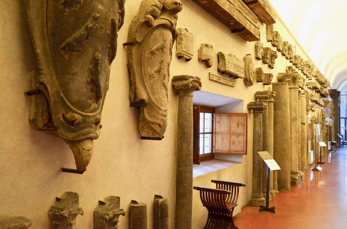 A ce stade, mieux vaut suivre mon plan avec attention pour ne rien manquer car il me reste à découvrir la Foresteria, lieu de passage (ci-dessous) transformé en lapidarium (ou musée lapidaire, c'est à dire un musée dont les collections sont principalement constituées de pierres). L'endroit recueillit ainsi les vestiges antiques de Florence qui furent mis à jour à la suite des fouilles entreprises lors de la restructuration de la ville au 19è siècle. Le même couloir donne accès aux cabinets de travail des prieurs. Au-dessus de chaque porte, on peut apercevoir le portrait d'un fondateur de l'ordre, comme, par exemple, Saint Dominique, Saint Pierre martyr, ou Saint Thomas d'Aquin....Dernier endroit remarquable au rez-de-chaussée, pour la superbe fresque qu'elle abrite, la salle du petit réfectoire (l'actuelle boutique du musée). Cette fresque (deuxième photo) représente le Cenacolo de Domenico Ghirlandaio. On se trouve ici à l'intérieur du petit réfectoire de l'ancien couvent San Marco. Similaire à la Cène, l'oeuvre décrit l'assemblée des apôtres, avec, en toile de fond, un paysage constitué d'arbres et d'oiseaux, comme ce paon symbolique à droite.