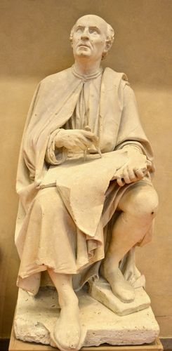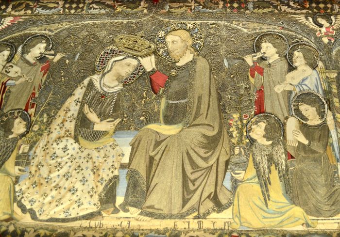 La dernière salle du rez-de-chaussée aborde des épreuves en plâtre du 19è siècle des grandes œuvres réalisées par les élèves de l'Académie. Je pense notamment à Luigi Pampaloni (et sa sculpture de Fillipo Brunelleschi, que l'on peut voir ci-dessous), ou à Silvestro Lega. Je grimpe ensuite au premier étage, où sont rassemblées les peintures florentines. L'école florentine fera partie de ces écoles italiennes de peinture qui se développeront du 13è au 16è siècle à Florence. On lui attribue généralement les principes de la Renaissance italienne en rupture avec le goût byzantin, à l'instar de ce que fit Giotto. Cette école florentine se différenciera toutefois de l'art pictural siennois, tout en recevant le plein soutien des Médicis, marchands et mécènes de la cité. Sa richesse et son foisonnement seront tels qu'elle contribuera à la découverte d'autres techniques picturales comme cette tapisserie en photo ci-dessous, qui représente encore le Couronnement de la Vierge, une œuvre de Jacopo di Cambio.