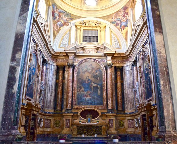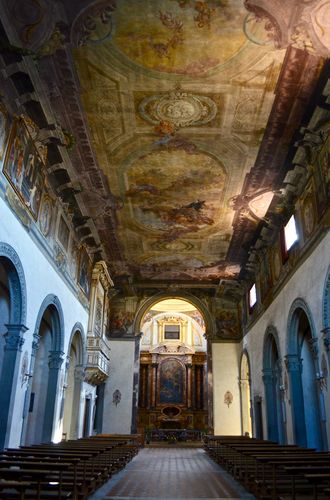 Le temps, enfin au beau fixe, rend cette promenade particulièrement plaisante, et je ne tarde pas à franchir le seuil de ce qui fut jadis un couvent bénédictin (en 1257), puis cistercien (dès 1322) qui sera transféré aux Carmélites au 17è siècle, je veux bien entendu parler de Santa Maria Maddalena dei Pazzi. Le lieu connaitra bien des aléas car les troupes de Bonaparte pilleront l'endroit lors de leur passage à Florence, et l'ensemble des bâtiments souffrira cruellement des crues de 1966. Une plaque, apposée sur l'un des murs du cloitre souligne d'ailleurs que la France participa financièrement à la restauration de l'édifice. Lors de ma venue, seul un sans-abri erre dans le jardin et je doute que l'église ne soit ouverte. Je pousse la porte et celle-ci s'ouvre comme par miracle, me laissant le champ libre à la découverte d'un plafond orné d'une magnifique fresque (première photo) et de la chapelle principale (deuxième photo) qui se para en 1675 de marbres polychromes réalisés par Ciro Ferri, ce qui fait de cette église florentine l'un des rares exemples de style haut baroque.