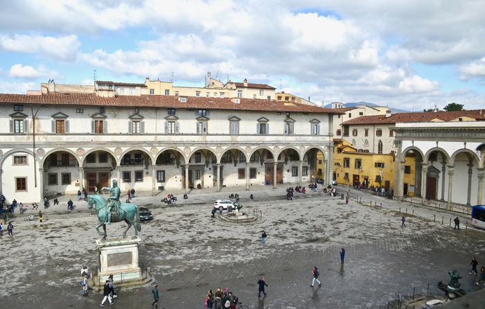 Partons maintenant pour l'Hôpital des Innocents qui donne sur la fameuse Piazza della Santa Annunziata (ci-dessous), une des plus belles places de la ville. Le projet final n'aboutit jamais mais cela ne retire rien à la beauté de l'ensemble : la statue équestre de Ferdinand 1er, une des dernières œuvres de Jean de Bologne, achevé en 1608, se dresse fièrement au centre de la place tandis que deux fontaines de bronze, réalisées par Pietro Tacca, l'assistant de Jean de Bologne, traversent le temps imperturbablement.