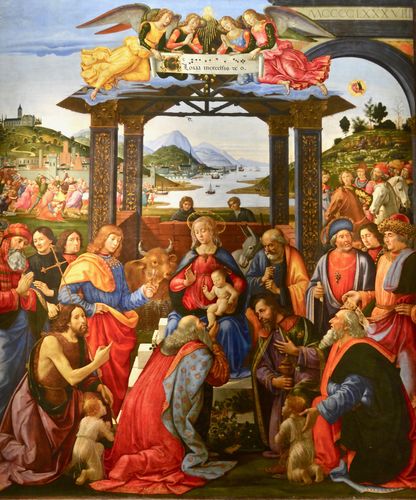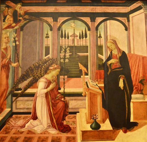 En fait de colosse, c'est par la salle du même nom que je fais mon entrée dans ce temple des œuvres d'art. J'y apercevrai d'abord l'oeuvre de Jean de Bologne, « L'enlèvement des Sabines », une sculpture représentant trois figures : un homme soulevant une femme au-dessus d'un deuxième homme accroupi. Je comprends mieux la performance de l'artiste lorsque j'apprends que celui-ci a réalisé cette œuvre à partir d'un unique bloc de marbre. Cette sculpture, placée au centre de la salle, est entourée de grandes œuvres majeures florentines de maitres comme Paolo Uccello, Sandro Botticelli, Le Pérugin, Filipino Lippi ou Ghirlandaio...N'étant pas un grand connaisseur, où arrêter mon regard et quelle œuvre choisir ? Je m'arrête finalement devant « L'Annonciation », tableau exécuté par Filippino Lippi (ci-dessous).